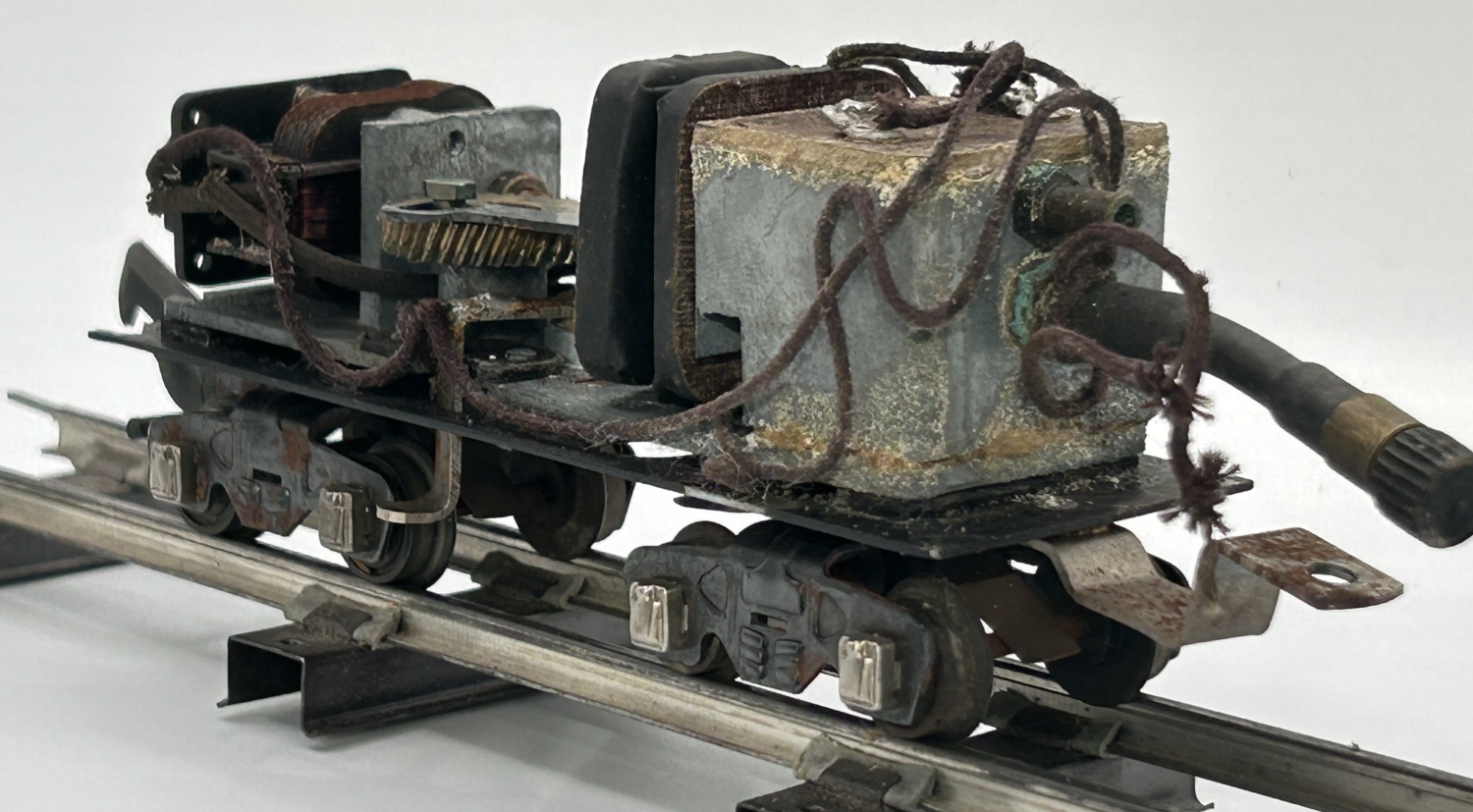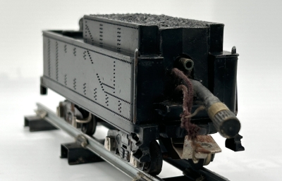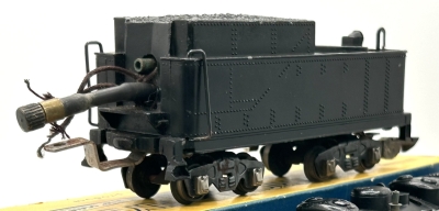 ![]() Smoke Unit with Front Fill TubeProbably the most striking variation in this particular locomotive is it's smoke unit. It had the fill tube on the front of the unit, just under the fitting that sent the smoke through the tube to the smoke stack. It consisted of a short rubber tube with a cap fitting that could be moved out to enable refilling of the smoke unit, rather than the filler tube extending through the coal pile in the tender that appeared on production units. The absence of the hole in the tender coal pile might be more esthetically pleasing, but these units were most likely a nuisance to fill. This smoke unit fills in a way similar to the Erector Smoke Unit that was later offered in 1950 for use in Erector set models. |