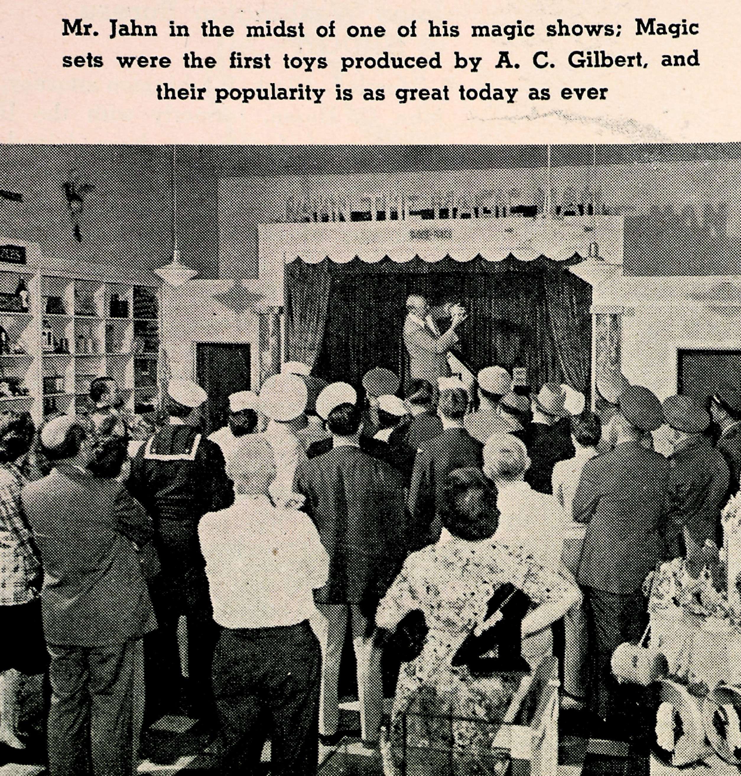 Leroy Jahn's first store at 300 E. Flagler Street was quite large with its entrance at the corner of E. Flagler and S.E. Third Avenue,. The major part of the store extended down S.E. Third St, which provided room for the long sign that proudly proclaimed it as the "Gilbert Hall of Science," as well as "Jahn, the Magic Man." The layout inside wasn't spectacular, but rather like what one would find in a large department store. So far, the only photos that have turned up of this store are those that appeared in Toys and Novelties magazine in 1945 and 1947. Frank Castiglione is reported to have been sent to Miami in the early 1950's to build a layout, so the store may have had a different layout later in its history. Leroy Jahn's interest in magic was definitely a big part of the operation of the store as it even included a stage for magic shows, as seen in one of the photos below. Thanks to Roger Carp and Firecrown Media, I can present several of these photos as shown below. These photos have recently appeared in a Special Issue titled Display Layouts and Showrooms, which is available at this link. That issue also contains photos of many other photos from this americanflyerdisplays.org website. |