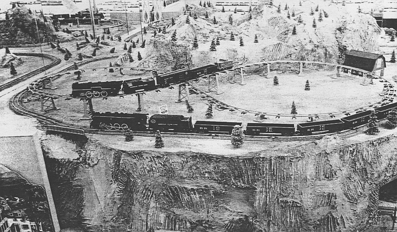 This view shows the changes that have been made in the upper level, which formerly was home to an HO loop and a much larger mountain. HO was no longer being sold and the trestle set was a new item.