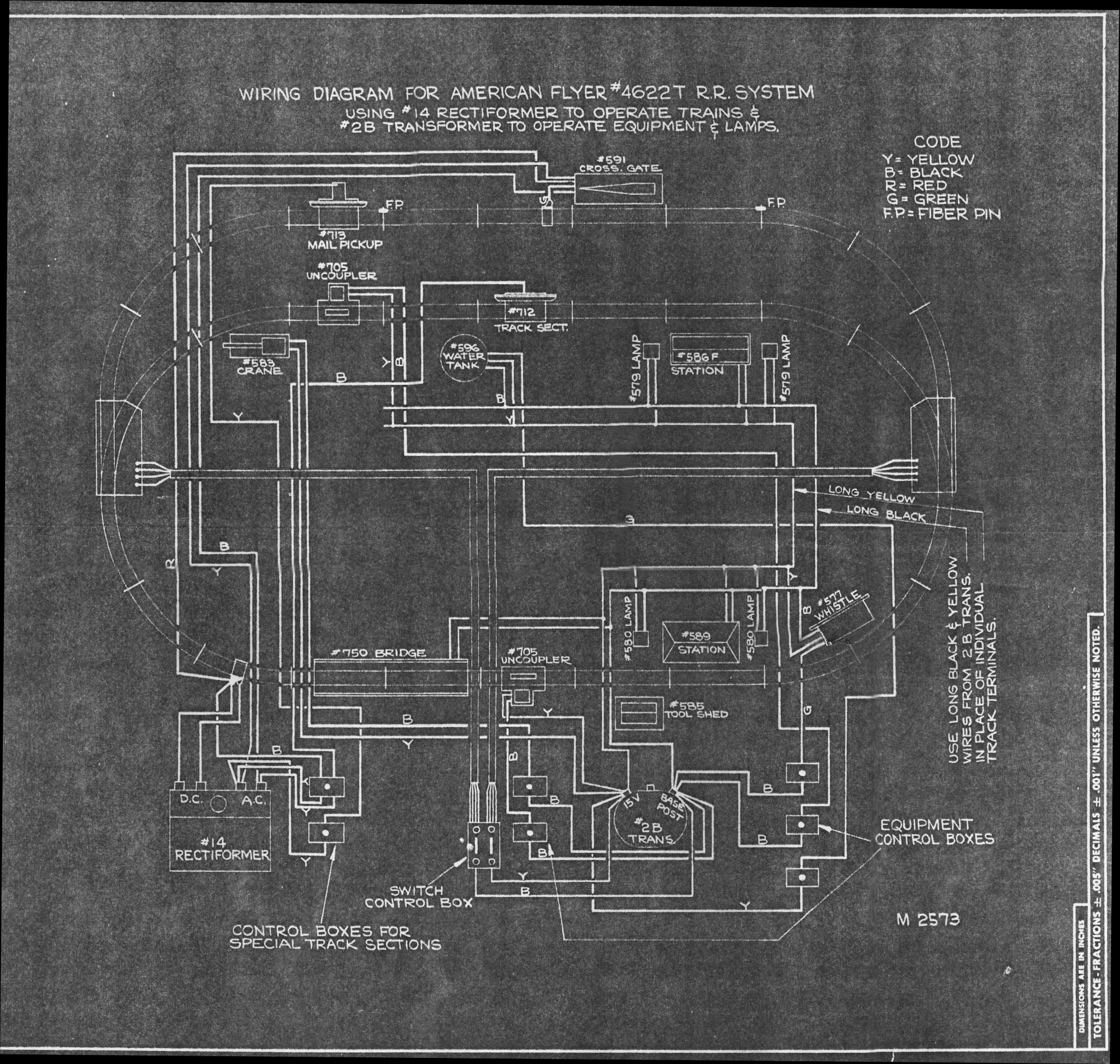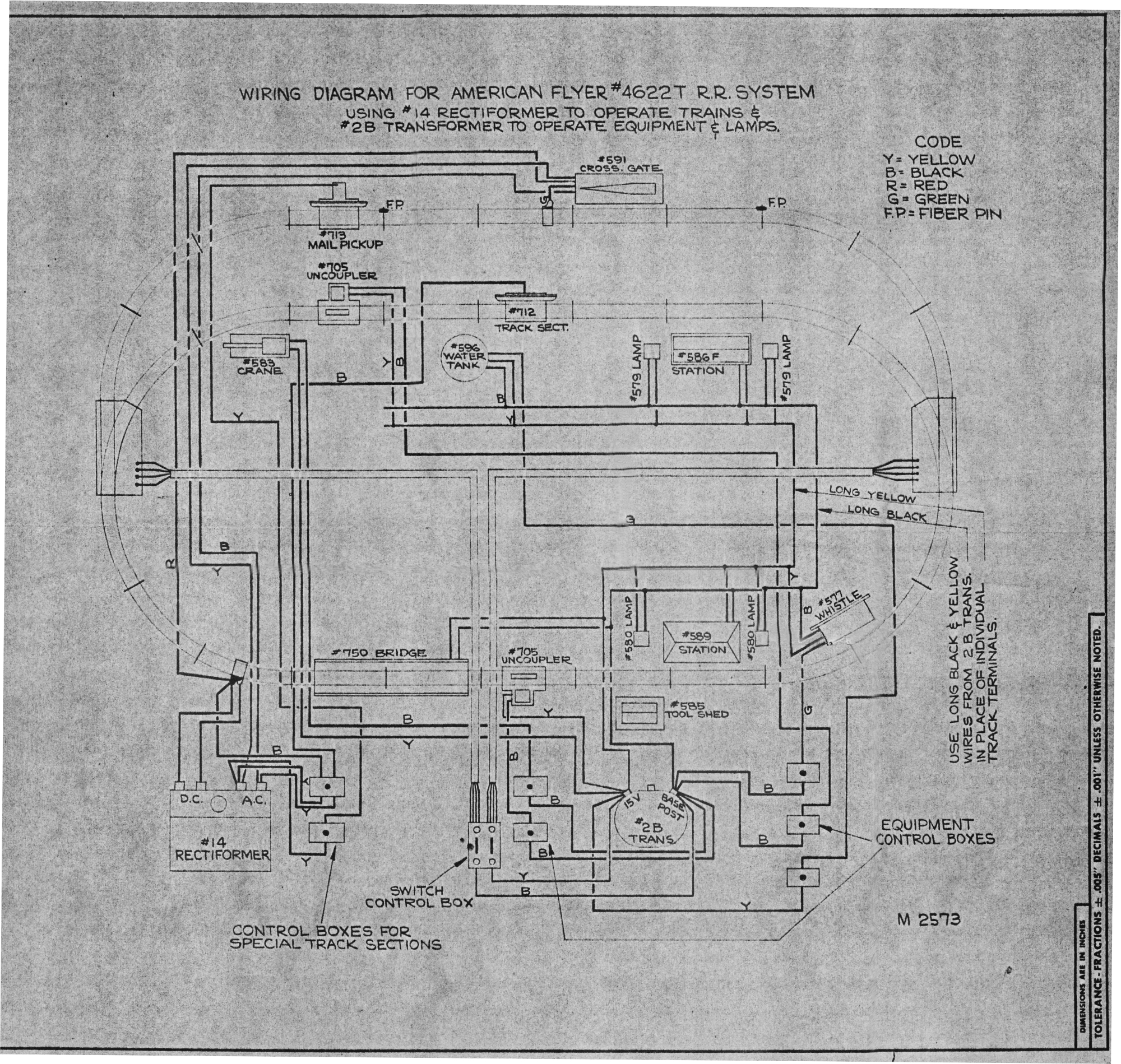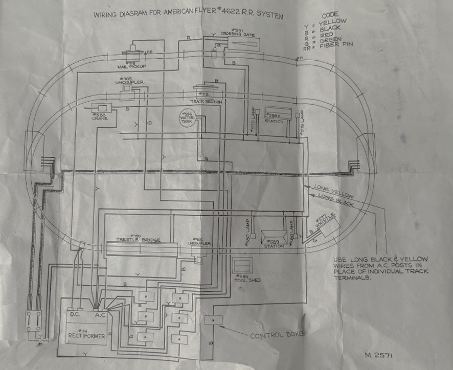 A Big 2 Train LayoutThe "Complete Railroad System" was a set containing two complete trains headed by new "Electronic Propulsion" DC powered locomotives, a 4-8-4 Northern and an 0-8-0 Switcher. In addition, several accessories, including action accessories, were provided. Elsewhere on this website I have discussed its use as a dealer display. While Gilbert intended to include the set in its 1946 line, production difficulties delayed its introduction until November 1947. This delay came about because of labor problems, material shortages, the diversion of resources to the development of the smoke in boiler units, and production problems related to the number 14 Rectiformer, which was essential to the operation of the DC Northerns and 0-8-0's. In fact even AC Northerns and 0-8-0's were rare in 1946 with the only supply being the models that were made for the 1946 New York Toy Fair and the Gilbert Hall of Science. In order to produce a two train set, the factory did release an uncataloged 4624 set in 1946, substituting a Hudson and a Pennsy K5 as motive power with a few car and accessory substitutions.1 In addition, the remote control switches shown in the illustration above were not included with the substitute set. The originally planned set was promoted in the consumer catalog and also in the dealer advance catalogs of 1946 and 1947, where its virtues as a store display were were presented. Click here for more about that. Today very few of these sets have been found which is not surprising considering that the cost of this set was beyond the means of most consumers. It is quite likely that the existing sets were purchased for use as store displays. Early sets came with a 100 watt version of the new "Rectiformer" power supply and the wiring diagram for that set is shown below at the left. It is quite likely that the large number of accessories, including operating cars were more than total power output of the Rectiformer could handle. Later versions of the set came with the Rectiformer and an additional 2B 75 watt transformer to provide power for the accessories. Only the special track sections for the operating cars were left on the AC side of the Rectiformer. A 150 version of the rectiformer would later be produced, but too late for this set. The wiring Diagram for that set is shown below at the right. Below the wiring diagrams, you will find the sales mats for these sets. Click on the images for an enlarged view. In 2024, an early 4622 set sold at auction and photos of that set are shown in the slide show link below. That set does not have a 2B transformer and came with a different wiring diagram which is shown below. That diagram has an earlier "M" number (2571 as opposed to 2573 for the set that includes the transformer), which indicates an earlier set. It is believed that the "T" suffix was added to the later sets containing the transformer.