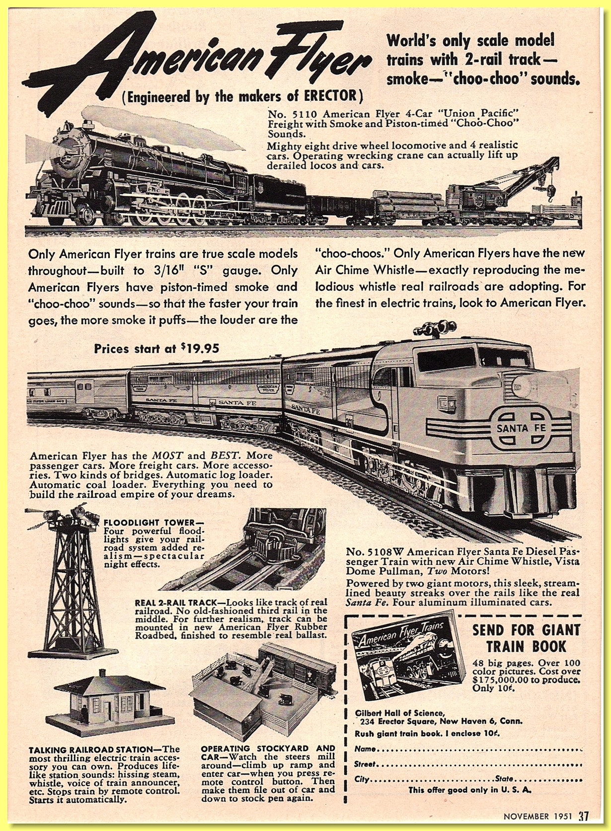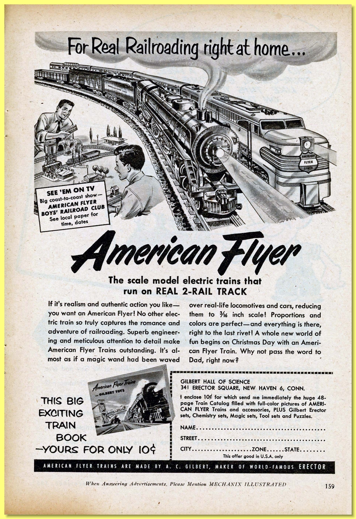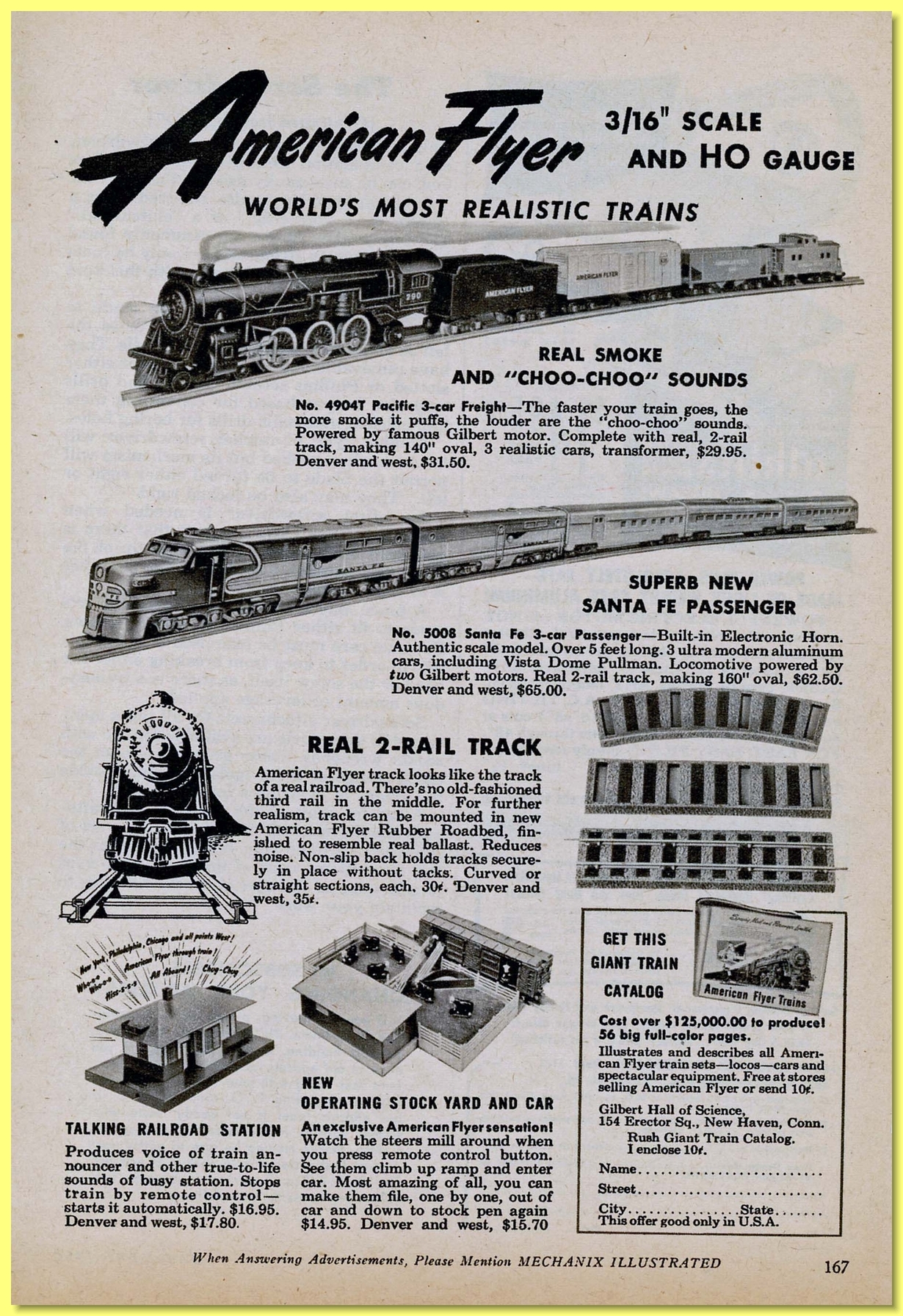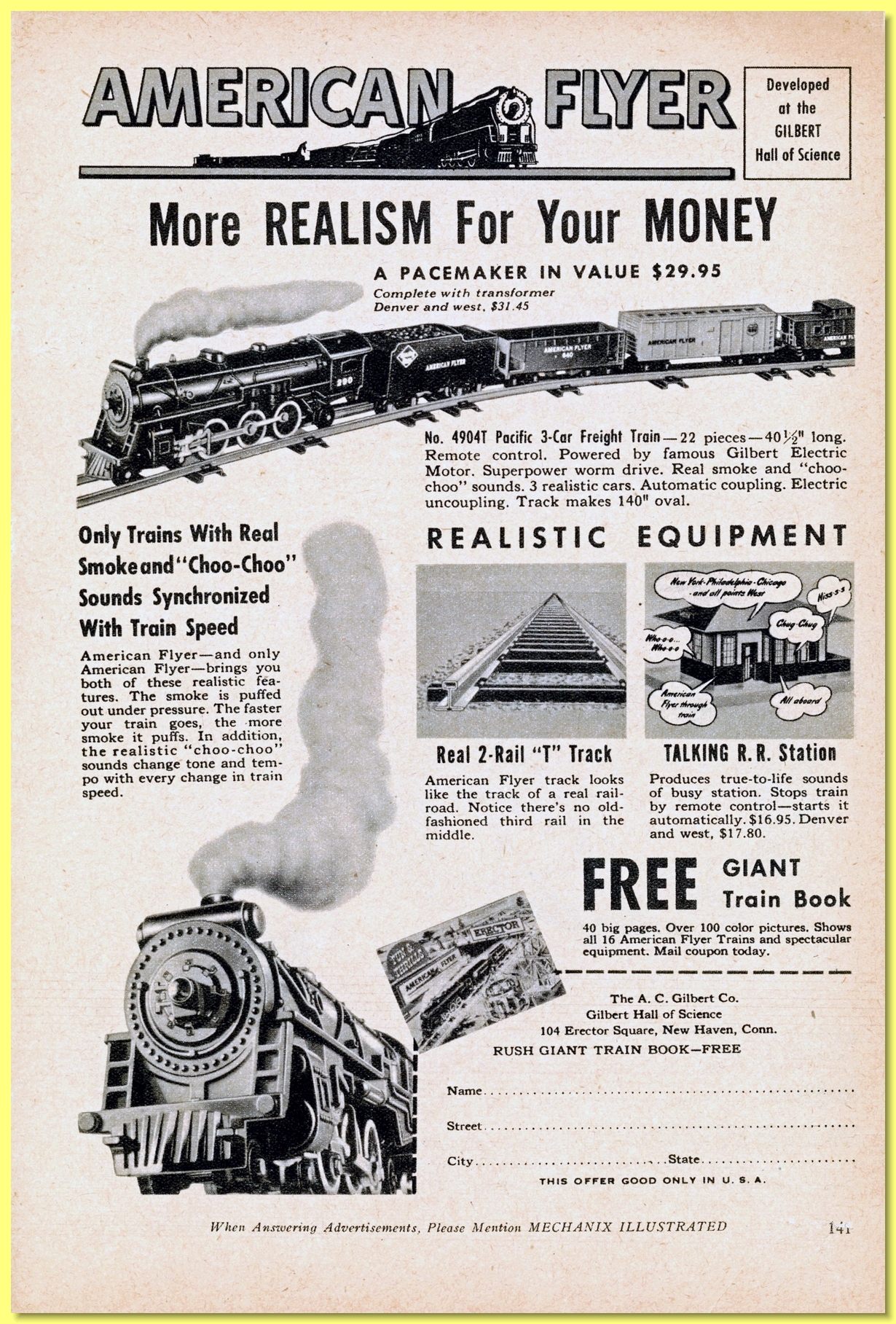 Mechanix Illustrated - December 1945. Same ad also appeared in Popular Science of that same month. It is interesting to note that the train set pictured appears to contain S gauge cars. In fact the consist of the K5 set is what was found in the 4619 set cataloged in 1946. - Courtesy of Daryl Olszeski