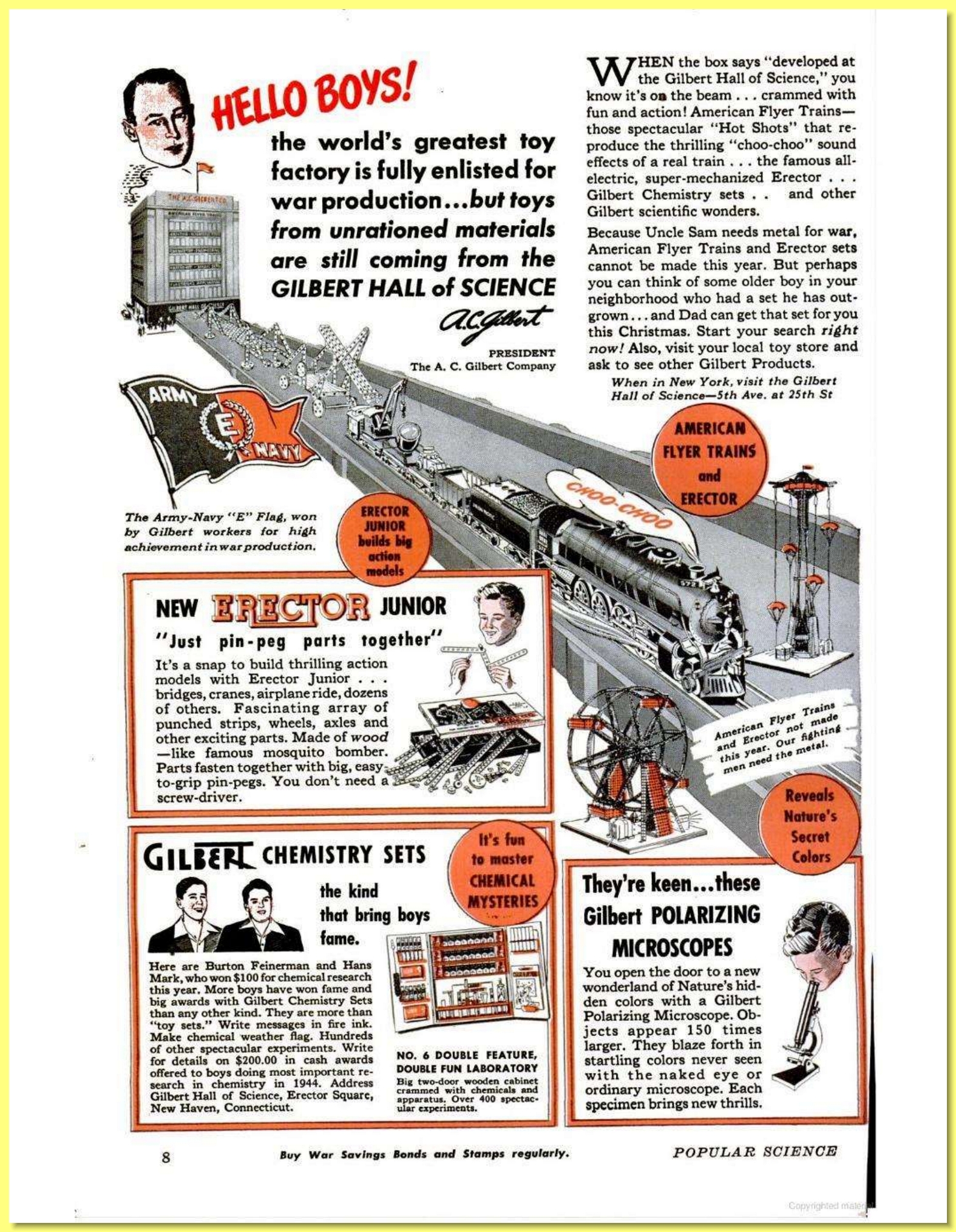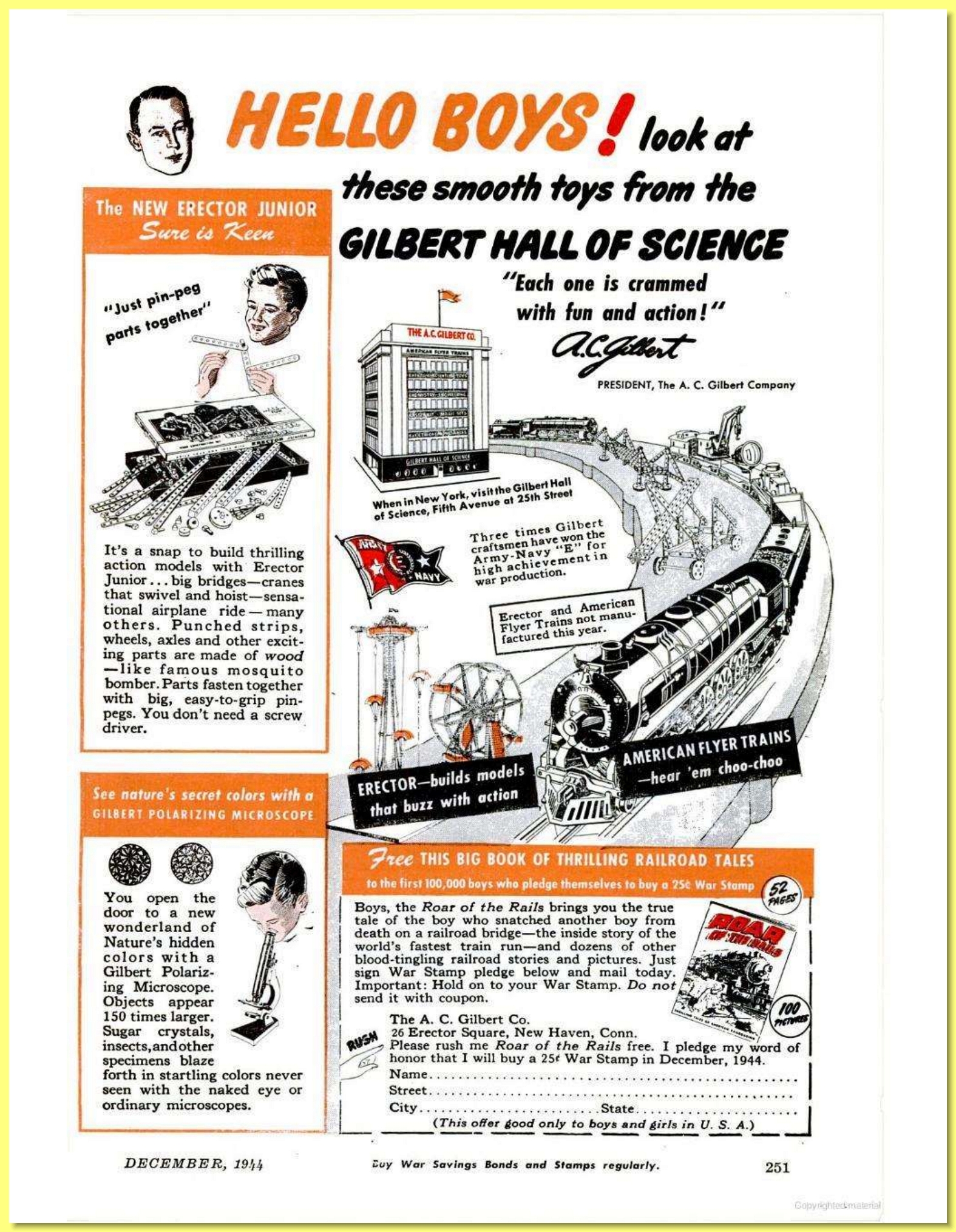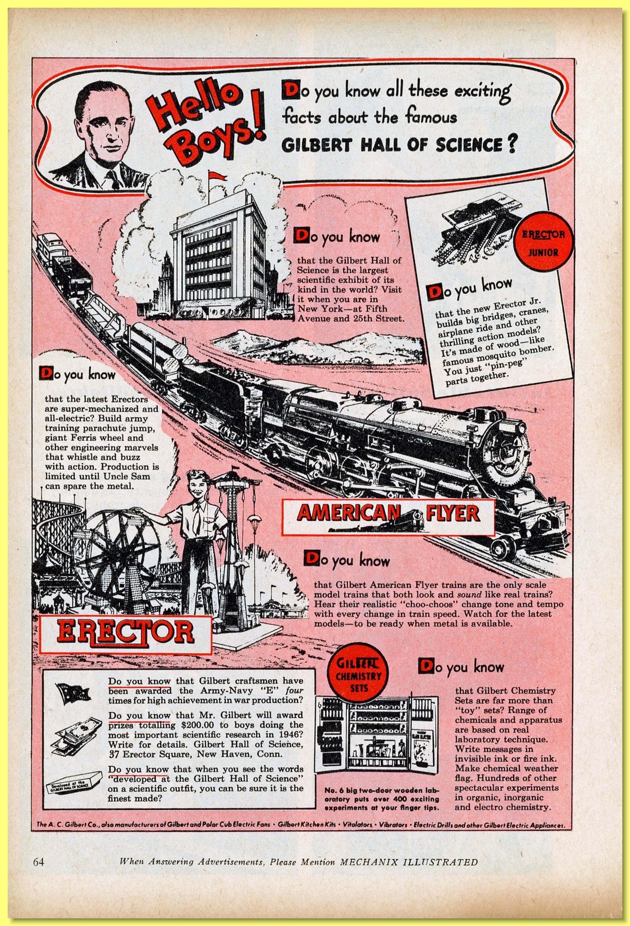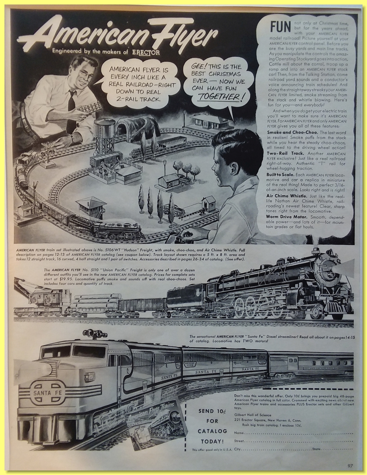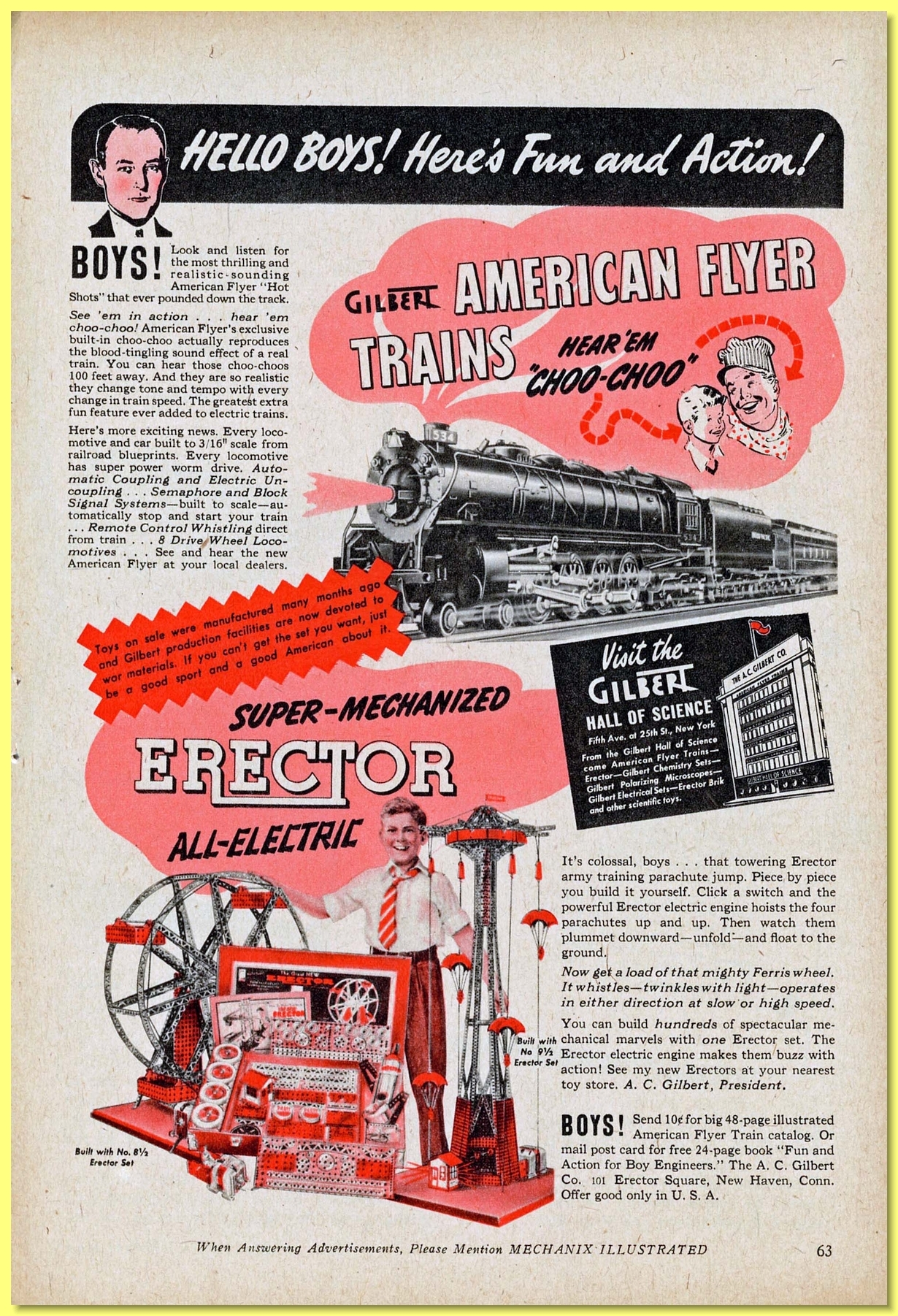 Mechanix Illustrated - December 1945. Same ad also appeared in Popular Science of that same month. It is interesting to note that the train set pictured appears to contain S gauge cars. In fact the consist of the K5 set is what was found in the 4619 set cataloged in 1946. - Courtesy of Daryl Olszeski