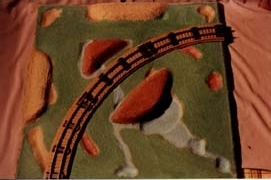 First of all, the patent set out the construction material as "a plastic or fibrous material such a papier-mâché deposited upon or formed between molding patterns." It notes that the surface would be molded with upraised hills and depressions. The depressions in addition to preventing the surface of the panel from looking unnaturally flat, also served as a multitude of feet to support the raised surface of the panel. The hills were supposed to be placed irregularly in relation to the center of the panel so that the panels would not produce symmetrical features when placed together. Also some of the hills were to mate with their other halves on adjacent panels, producing hills that extended from one panel to the next. Finally, there were multiple flat areas for the placement of track. Apparently the chosen material for construction was papier-mâché, which caused the end product to resemble the material used in egg cartons. I don't really think these panels were intended to be assembled and disassembled, as this papier-mâché construction was not durable enough for this.