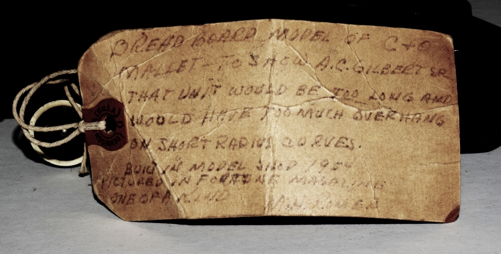 A.C. Gilbert had the idea to build an articulated Mallet locomotive, but the engineering department told him it would be too long to take the Flyer curves. Not willing to accept that as the final word, he said "show me," even though he wasn't from Missouri. So they did and as you can see from the photos below they were right and the model was never produced. Even using the smallest wheels, those from their 0-6-0 or 0-8-0 switchers, which were really too small, it still didn't work. They could get it to negotiate the curves, but the overhangs were too extreme. The tag below tells the story.