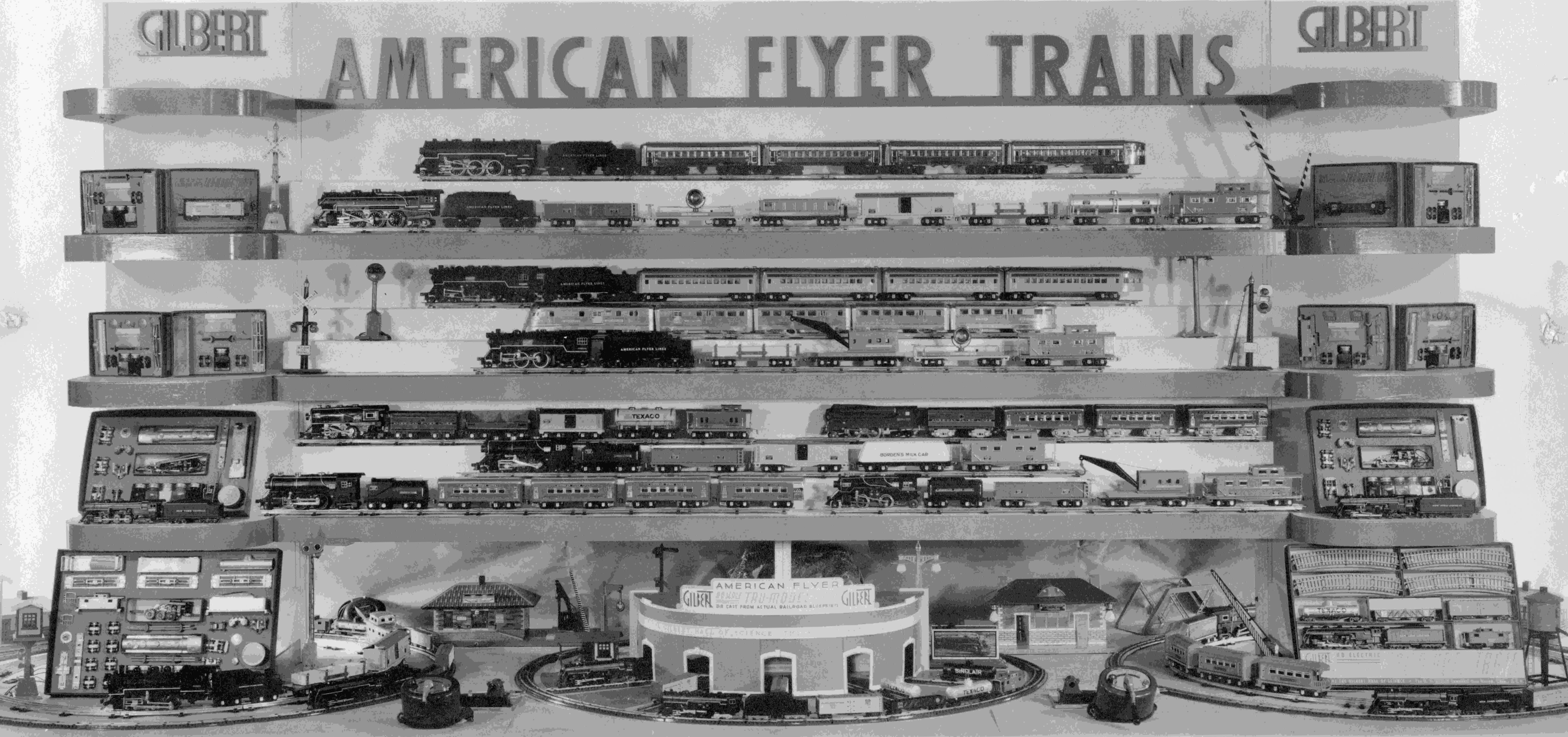 The location of this display is not known for certain. Bill Drake, who provided this photo thinks that it might have been at the factory or in a department store. The photo was obtained from the estate of a Gilbert engineer. The product line is consistent with what was being sold by Gilbert in 1938 and includes a sizeable number of Chicago Flyer items. Click on the image to explore a larger version in detail. | |